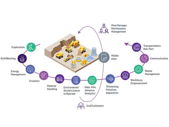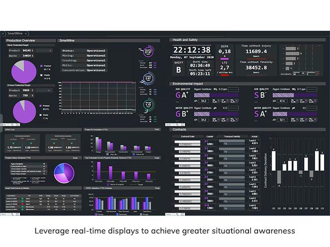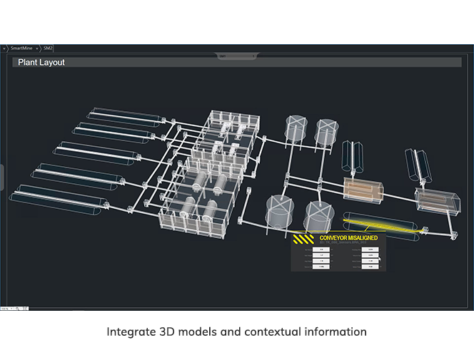 Dies kontextualisiert umsetzbare Informationen und bietet einen allgemeinen Überblick über die Abläufe zwischen Mine und Hafen sowie über die Subsysteme, die bestimmte Bereiche wie Zerkleinerer, Verarbeitungsanlagen und vernetzte Mitarbeiter verwalten.