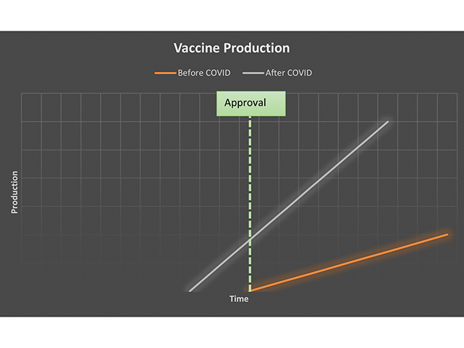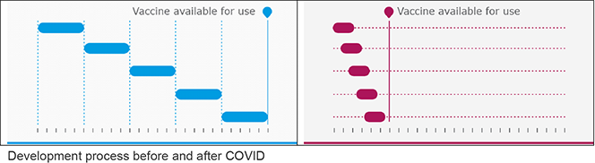 Before the COVID-19 pandemic, pharmaceutical companies typically ran process steps in a series, often taking eight to ten years in a development cycle. Today, with government support and investments into the research, development, and manufacturing processes, companies are taking higher risks to execute many steps in parallel. This means that companies have been producing vaccines before receiving approval to supply the market. Parallel operations and testing made it possible for pharmaceutical companies to deliver new, safe vaccines to the market in less than one year.