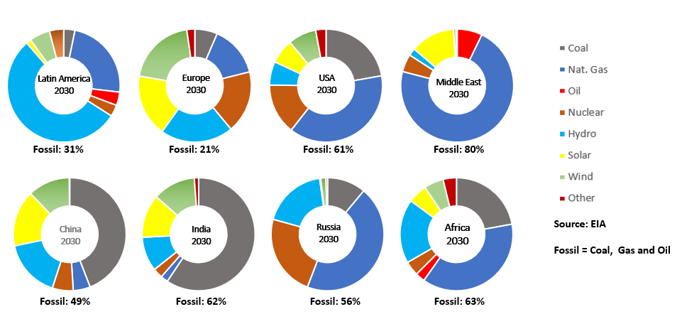 The move to renewable sources of electricity generation can be felt in every region of the world. However, this move cannot happen overnight. There is willingness by governments and citizens to adopt greener sources of electricity. However, economic and technological factors still point to fossil fuels being a significant contributor to the fuel mix for the next 10-20 years. The picture below depicts the projected electricity generation mix for different world areas for the year 2030, according to the Energy Information Administration.