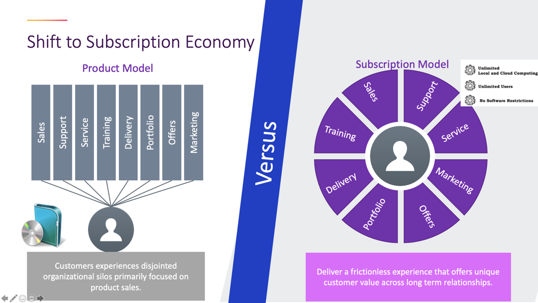 The 'subscription economy' is a term, coined by Zuora, describing the shift away from the traditional pay-per-product model to a subscription model. The shift to selling products and services based on measurable outcomes requires more than implementing cool technologies. It requires viewing the customers as people first and to bring about the most positive customer experiences.