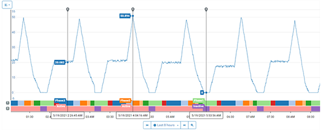 AVEVA Data Hub redefines how we visualize digital states. Digital states are often used to track stages of a process or a piece of equipment. A pump in your unit had downtime last week - did that pump fail or was it just in maintenance? A digital state would answer that question for you. AVEVA Data Hub seamlessly merges this information into your trends to help you draw meaningful conclusions. In AVEVA Data Hub you can display digital states as colorful bands underneath your trend. These bands allow you to visualize where certain changes in your process are occurring without interfering with the trends on your display.