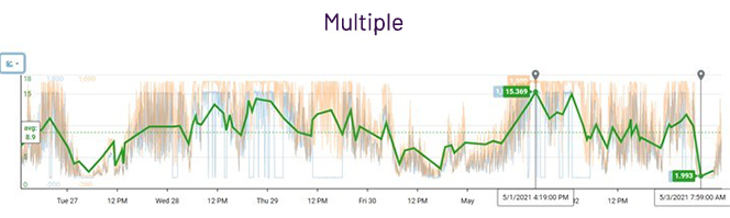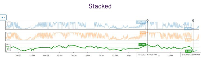 Finding the right scale for your trend makes those flat lines come alive. AVEVA Data Hub offers the traditional single and multiple scale options and introduces a stacked option. This allows you to stack each of your selected data streams on top of one another, making it much easier to compare trends at the same point in time. Combining stacked trends and the easy cursor functionality creates a unique visualization experience. Hover over your stacked trends to find an exact spot, then pin the cursor with a single click to start exploring.