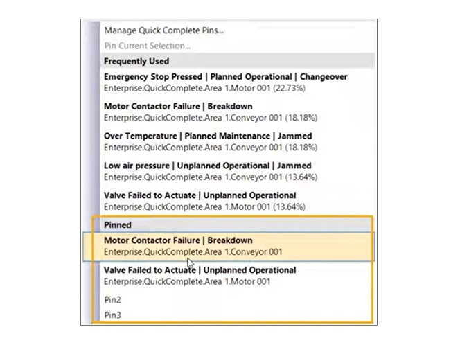 Built on the success of the Quick Complete feature, this release allows users to ‘pin’ specific downtime reason codes, in addition to the existing Top Five option. Customers can even use their own aliases for pinned downtime reason codes.