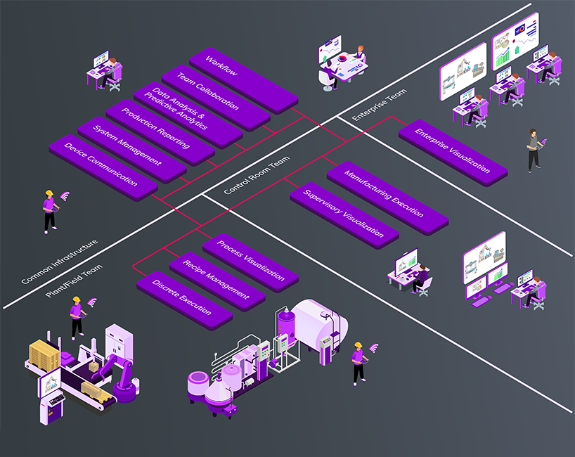 Los equipos de operaciones comparten objetivos comunes, incluso estando distribuidos en diversos niveles de la organización o en diversas ubicaciones físicas. Aunque las perspectivas en cada nivel de operaciones pueden ser diferentes, la necesidad común de tomar decisiones prácticas requiere soluciones de software capaces de conectar equipos de toda la empresa.