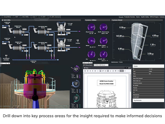 Dies kontextualisiert umsetzbare Informationen und bietet einen allgemeinen Überblick über die Abläufe zwischen Mine und Hafen sowie über die Subsysteme, die bestimmte Bereiche wie Zerkleinerer, Verarbeitungsanlagen und vernetzte Mitarbeiter verwalten.