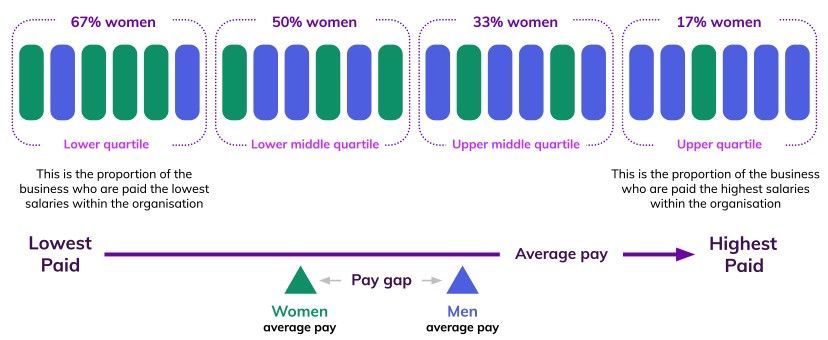Because there are more women in the lower pay quartiles of the organization, and more men in the upper quartiles, average pay for women is lower than average pay for men. This can happen even though pay parity is achieved, ensuring people are paid the same for the same work.