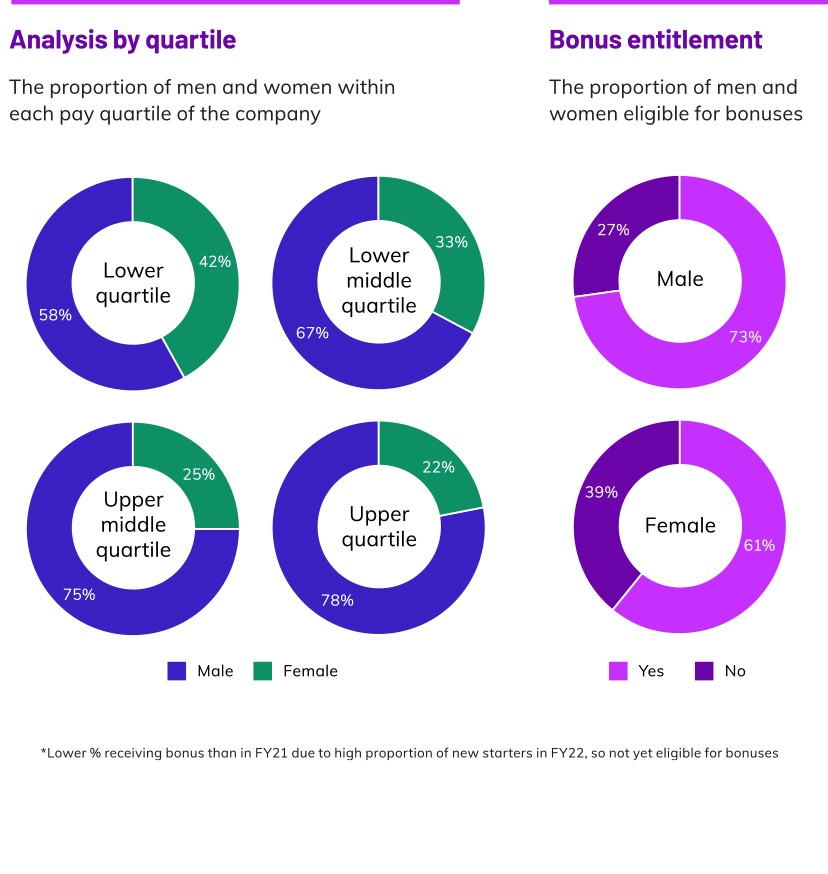 The pay gap is defined the percentage difference between average earnings of demographic groups within the company, spanning all levels of seniority.